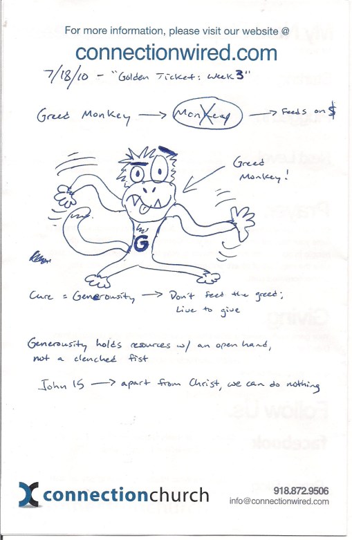 On Sunday I talked about the “Greed Monkey.” If you missed it you can listen to it here. We all have a Greed Monkey on our back that tells us, “You want it, you need it, you gotta have it.” I made an off-handed comment about drawing a Greed Monkey, if you’re a bit ADD like me, and said I would post them on my blog. Here’s a couple I got after church.